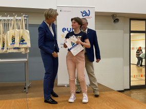 Es passte daher hervorragend, dass die diesjährige Preisverleihung des Europäischen Wettbewerbs im nach Friedrich Rückert benannten Gymnasium in Düsseldorf stattfand. NRW Schulministerin Dorothee Feller griff diese Vorlage bereitwillig auf und lobte die inspirierenden Arbeiten der Schülerinnen und Schüler. Besonders hob sie die Wichtigkeit von Demokratiebildung und die Bereitschaft zum Handeln für den europäischen Gedanken hervor.