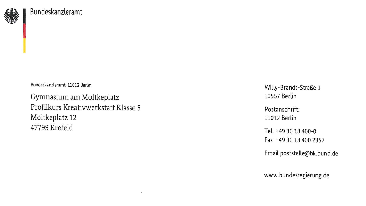 In den Sommerferien erreichte die Schule eine Antwort aus dem Bundeskanzleramt, die die Pressestelle verfasst hatte. Es wurde spezifisch auf die Themen und Fragen eingegangen, auch die Haltung der Bundesregierung sowie konkrete Projekte kamen zur Sprache. Ein echter Erfolg für unsere Kreativwerkstatt, die es nicht nur geschafft hat, sich mit einem so hochkomplexen Thema zu befassen, sondern auch noch Antworten auf ihre brennenden Fragen aus Berlin erhalten haben. Ein herzlicher Glückwunsch für diesen kleinen politischen Erfolg! Vielleicht entdecken wir in ein paar Jahren ja auch ein buntes Werbeposter einer Schülerin oder eines Schülers aus der Kreativwerkstatt auf den Straßen Krefelds wieder?