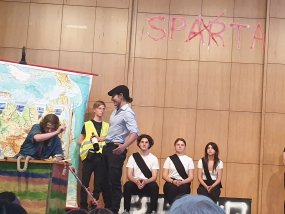 Am Mittwoch, den 13. Juni 2023, war es nach fünf langen Jahren wieder so weit: Der Literaturkurs der Q1 konnte ihr Theaterstück „Der Frieden“, für welches die Schülerinnen und Schüler das gesamte Schuljahr geübt hatten, live in der Aula aufführen.
