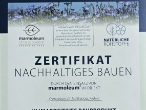 24.02.2025: Das Gymnasium am Moltkeplatz wurde für seine nachhaltige Sanierung mit dem renommierten Zertifikat für nachhaltiges Bauen ausgezeichnet. Die Ehrung erfolgte durch die Firma Forbo Flooring Systems und würdigt die innovative und umweltfreundliche Modernisierung des Anbaus der Schule.