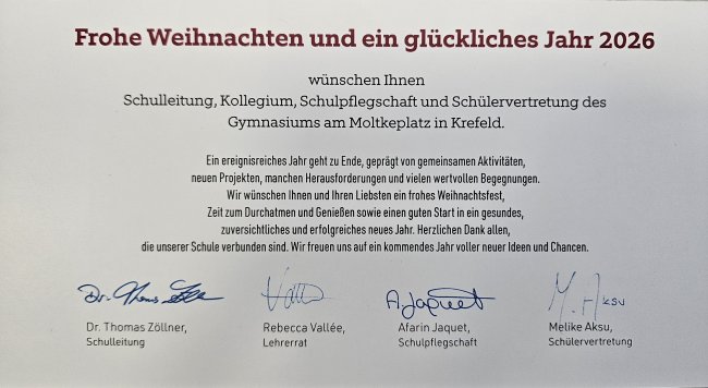 Anfang Februar 2026 beginnt am Gymnasium am Moltkeplatz die Anmeldephase für das Schuljahr 2026/2027. Die Eltern der jetzigen Viertklässler können ihr Kind an folgenden Terminen anmelden: Freitag, 06. Februar 2026 von 09:00 bis 17:00 Uhr, Montag, 09.02. und Dienstag, 10.02. (jeweils von 09:00 bis 17:00 Uhr). Für die Anmeldung ist es erforderlich, einen Termin zu buchen und das Anmeldeformular auszufüllen.