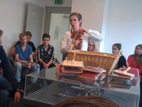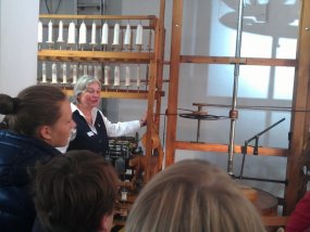 Des Weiteren besichtigte die Klasse das prachtvolle Herrenhaus des durch den Handel mit Textilien zu Wohlstand gekommenen Unternehmers Brügelmann. Am Ende der Führung hatten die Schüler/innen selbst die Möglichkeit, das Spinnen auszuprobieren.
