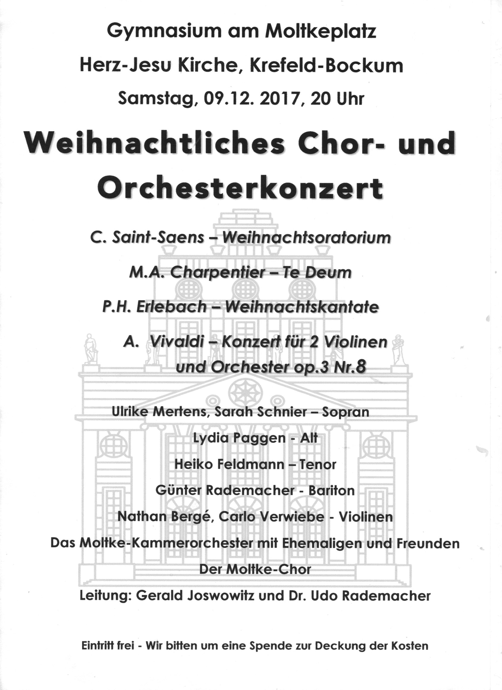Mit Günter Rademacher als Solo-Bariton, Dr. Udo Rademacher als Dirigent des Vivaldi-Konzertes und Gerald Joswowitz als Chor- und Orchesterleiter der übrigen Programmpunkte war fast die gesamte Musik-Fachschaft des Moltke-Platzes aktiv vertreten. Doch damit nicht genug: im Kammerorchester musizierten Ehemalige, aktive Schüler, Eltern und Freunde des „Moltke“ auf hohem Niveau und in perfekter Harmonie und erbrachten so die akustische Version unseres Schulmottos „Gemeinsam mehr erreichen“!