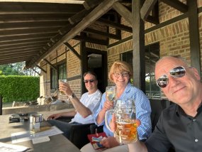 An einem Bilderbuch-Sommerabend im Mai 2025 versammelten sich 48 "Lenzerinnen" und "Lenzer" (von 71) sowie sechs Lehrer/innen auf der Terrasse einer fabelhaften Privat-Location mit Blick über die Verberger Felder zu einem lange erwarteten (eigentlich sehen wir uns alle fünf Jahre, das letzte Abitreffen fiel jedoch virusbedingt aus) und vielleicht deshalb besonders herzlichem Wiedersehen.