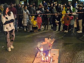 Die fünften und sechsten Klassen sangen Martinslieder und als Benedikt Neukirch (Q1), verkleidet als St. Martin, ans Feuer trat, um Sarah Spitz (Q1) als Bettler seinen Mantel zu reichen, funkelten die Augen der Zuschauer. Passend zu diesem Schauspiel spielten die Bläser: innen das Martinslied, in das die Fünft- und Sechstklässler kräftig mit einstimmten. Danach konnten sich die Kinder im Eingang des Gebäudes ihre Tüten holen, draußen Currywurst essen oder etwas trinken. Als schließlich starker Regen einsetzte, gingen viele ins Foyer der Schule, um weiter zu feiern und sich zu unterhalten. Insgesamt war das Martinsfest eine tolle Veranstaltung, die den Zusammenhalt der Schulgemeinschaft demonstrierte.