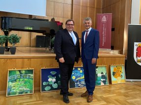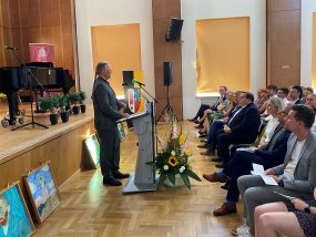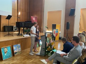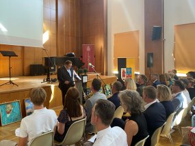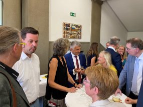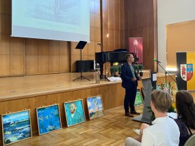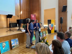 Nach der Begrüßung durch Frau Stein, in der sie ebenfalls betonte, dass Herr Dr. Zöllner seine „Feuertaufe als Schulleiter ohne Vize“ gemeistert habe, hielt auch Frank Meyer eine Ansprache. Der Oberbürgermeister erzählte, dass der Grundgedanke von Herrn Dr. Zöllner Zuversicht sei und dass dieses Leitmotiv einleuchtend für ihn sei, denn das sei das Fundament, das Kinder in diesen Zeiten brauchen würden. Seinen Erfolg verdanke Herr Dr. Zöllner seiner harten Leistung und außerdem handle er aus tiefster innerer Überzeugung, um das Gymnasium am Moltkeplatz zu einem zweiten Zuhause für Schülerinnen und Schüler zu machen. Die ersten Schritte sind laut Frank Meyer auch bereits getan. Nach einer weiteren Ansprache von Stefan Holtschneider und der Übergabe von einigen Geschenken an den neuen Schulleiter, darunter Blumensträuße und Weinflaschen, richteten die Vertreter der Krefelder Gymnasien sowie die Vertreter der Schülerschaft, Mia Schubert und Eric Ackermann, einige Grußworte an Herrn Dr. Zöllner.