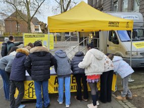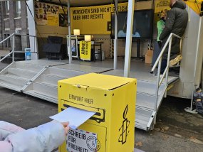 Poster, Dokumentationen und Berichterstattungen verschiedener Menschenrechtsverletzungen weltweit wurden vom extra angereisten Amnesty-Bus am 12. Dezember 2025 ausgestellt und es bestand für die Schüler:innen des Moltke-Gymnasiums die Möglichkeit, vorgedruckte Briefe zu unterschreiben, welche an die Regierung des betroffenen Landes gerichtet sind und Gerechtigkeit für ein Individuum oder eine organisierte Gruppe fordern. Das Ziel ist Quantität über Qualität, um in überwältigender Zahl die Einhaltung von Menschenrechten zu verlangen und für grundlegende Gerechtigkeit zu sorgen. Bereits zuvor war in den Religions- und Philosophiekursen unserer Schule im Zuge dieses Briefmarathons zu den Hintergründen der Inhaftierungen recherchiert worden, wobei teils erdrückende Erkenntnisse ans Licht kamen.