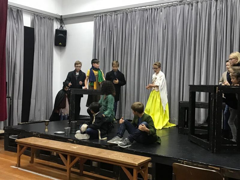 Nach einer Pause in der Theaterkantine erlebten die Sechstklässler den Höhepunkt des Vormittags: sie studierten selbst eine kleine Opernszene auf einer Probebühne des Musiktheaters ein. Jeder übernahm eine wichtige Rolle: die Bühnenarbeiter bauten die Kulissen auf, andere Schüler suchten die Kostüme aus, eine dritte Gruppe sorgte für die angemessene Beleuchtung und die Übrigen standen auf der Bühne und stellten die „Wolfsschluchtszene“ aus dem „Freischütz“ dar. Am Ende waren alle mit dem Ergebnis der Proben-Arbeit höchst zufrieden und werden diesen Besuch auf den Brettern, die die Welt bedeuten, wohl so schnell nicht vergessen!